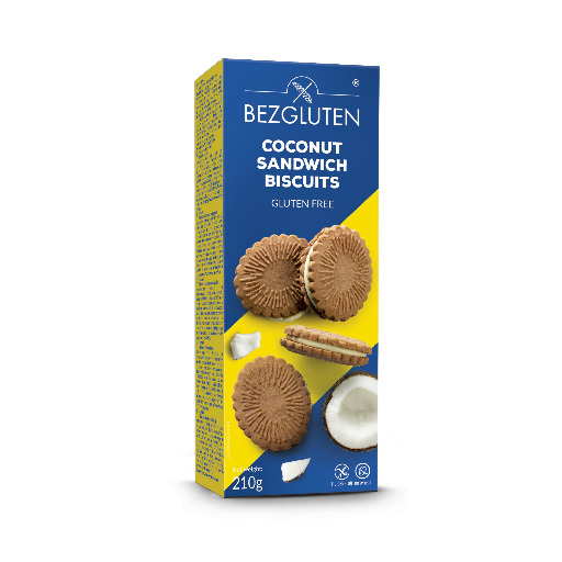 Печенье-сэндвич с какао и нежнейшей кокосовой начинкой без глютена. Имеет низкое содержание белка.