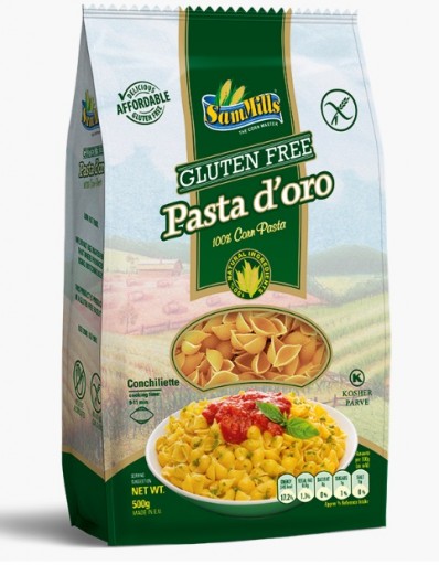 Кукурузные макароны без глютена торговой марки Pasta d’oro приятные на вкус, легко усваиваются организмом, имеют высокое содержание волокон. Безглютеновый продукт от румынского производителя безглютеновой продукции компании Sam Mills предназначен для людей, соблюдающих безглютеновую диету, в том числе больным целиакией и людей, склонных к аллергии на глютен.