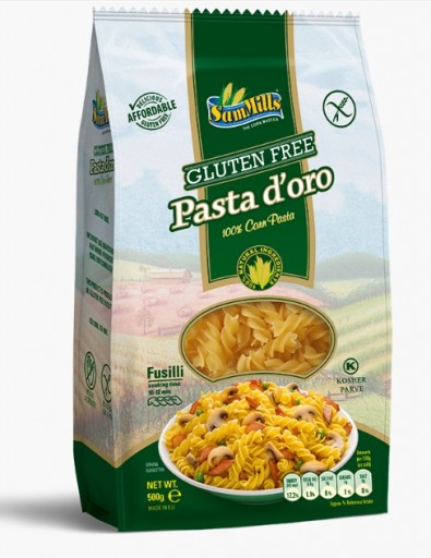 Кукурузные макароны без глютена торговой марки Pasta d’oro приятные на вкус, легко усваиваются организмом, имеют высокое содержание волокон. Безглютеновый продукт от румынского производителя безглютеновой продукции компании Sam Mills предназначен для людей, соблюдающих безглютеновую диету, в том числе больным целиакией и людей, склонных к аллергии на глютен.