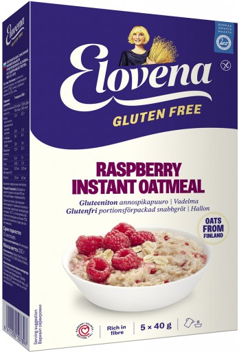 Овсяная каша без глютена с малиной торговой марки Elovena это продукт быстрого приготовления в порционных пакетиках. Достаточно высыпать содержимое пакетика в тарелку и залить кипятком. Через пару минут каша готова. Она содержит большое количество клетчатки, бета-глюкана, который помогает контролировать уровень холестерина в крови, состоит из 100% безглютенового овса, выращенного с использованием только генетически чистых семян овса на контрактных фермах. Чистота возделывания овса обеспечивается контролем качества на фермах, который осуществляется в течение всего вегетационного периода. Вблизи овсяного поля не допускают рост глютеносодержащих злаковых растений, овсяные зерна хранятся в отдельном хранилище, продукция производится на заводе, который не обрабатывает какие-либо другие зерновые. Продукт от финского производителя Raisio предназначен для людей, соблюдающих безглютеновую диету, в том числе больным целиакией и людей склонных к аллергии на глютен.