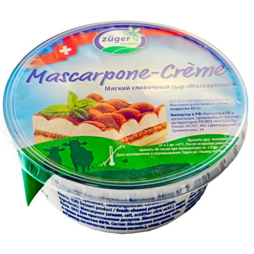 Мягкий сливочный сыр Маскарпоне - мягкий летний сыр изготовленный из сливок коров. Произведён в Швейцарии компанией Zuger Frishkase. Маскарпоне содержит 80% жира, имеет кремообразную консистенцию и идеально подходит для десертов. Только из этого сыра Вы сможете приготовить настоящий десерт «Тирамису»!